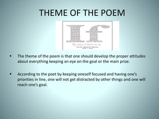 The poem If by Rudyard Kipling is a poem of ultimate inspiration that tells us how to deal with different situations in life. IF by rudyard kipling The poet. The poem is a father defining for his son the qualities of a good man.